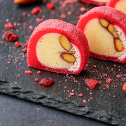 Lukums ar lazdu riekstu krēmu, mandelēm un aveņu pastilu